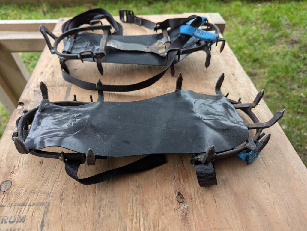 Hiking in the Adirondacks of upstate NY can get icy in the winter time. Rather than huddling at home to wait out the weather, we built custom crampons. All it takes is a MIG welder, an oxy-acetylene torch, some scrap steel, webbing and basic sewing skills.