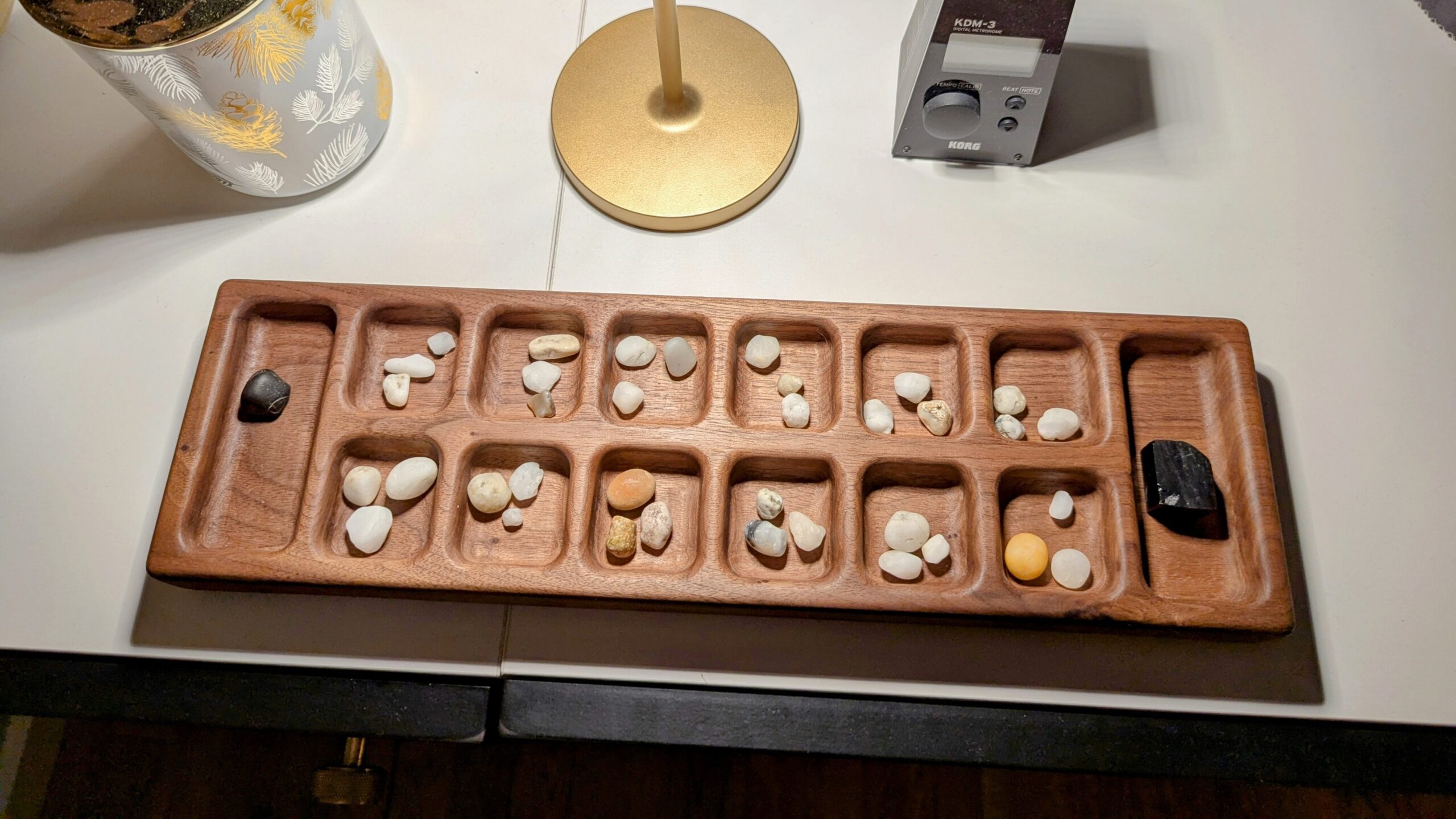 This project went through an evolution over a few months. The inspiration came from a family member who came home excited, having learned to play mancala earlier that day.