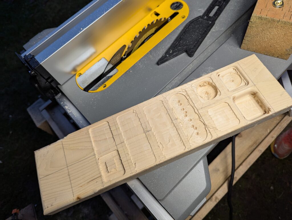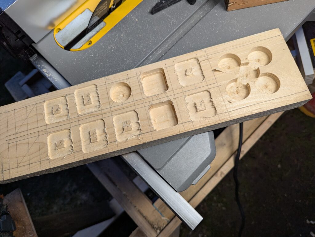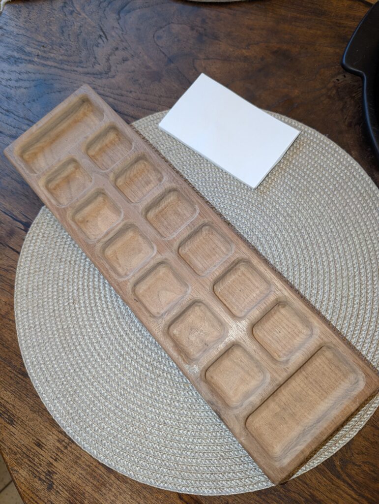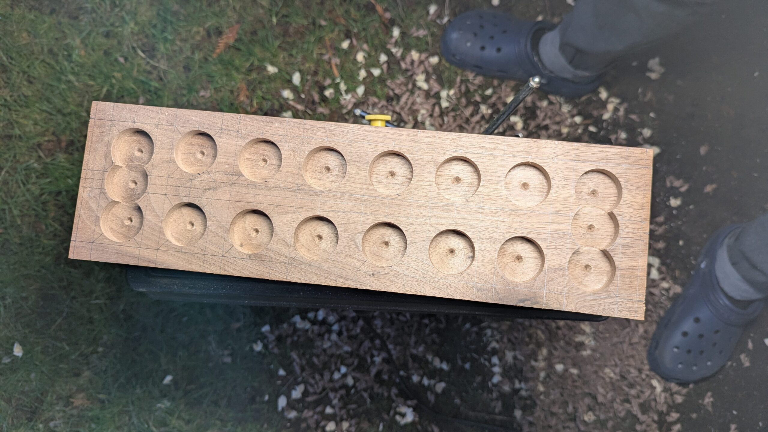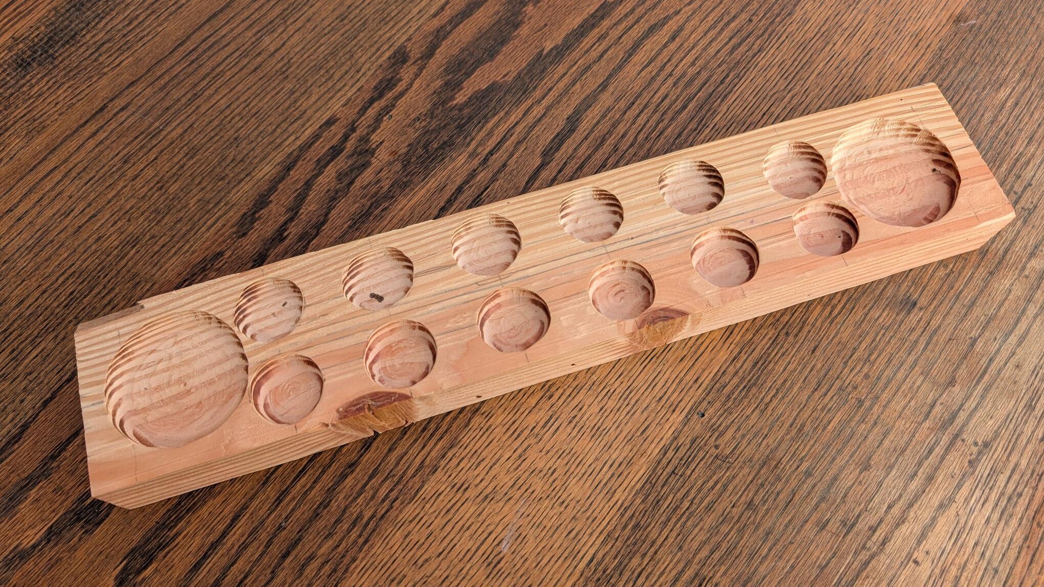 A an hour with a 2×4 and trim router led to the first prototype. Pretty ugly, but it served the purpose for a bunch of fun mancala sessions.