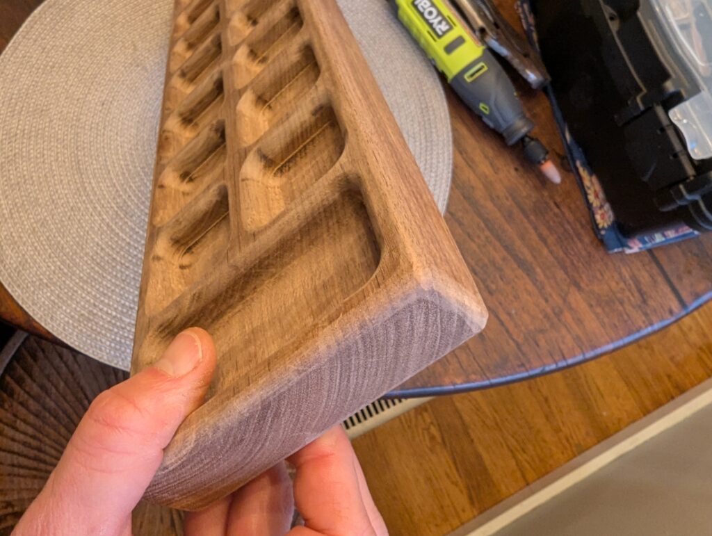 The Dremel took a while to carefully remove all the router burn and bit marks, but resulted in nice clear grain on the board. After some sanding down to 300 grit, raising the grain, and light re-sanding, and it is ready for finishing.