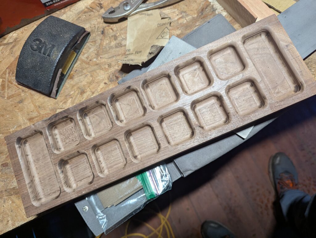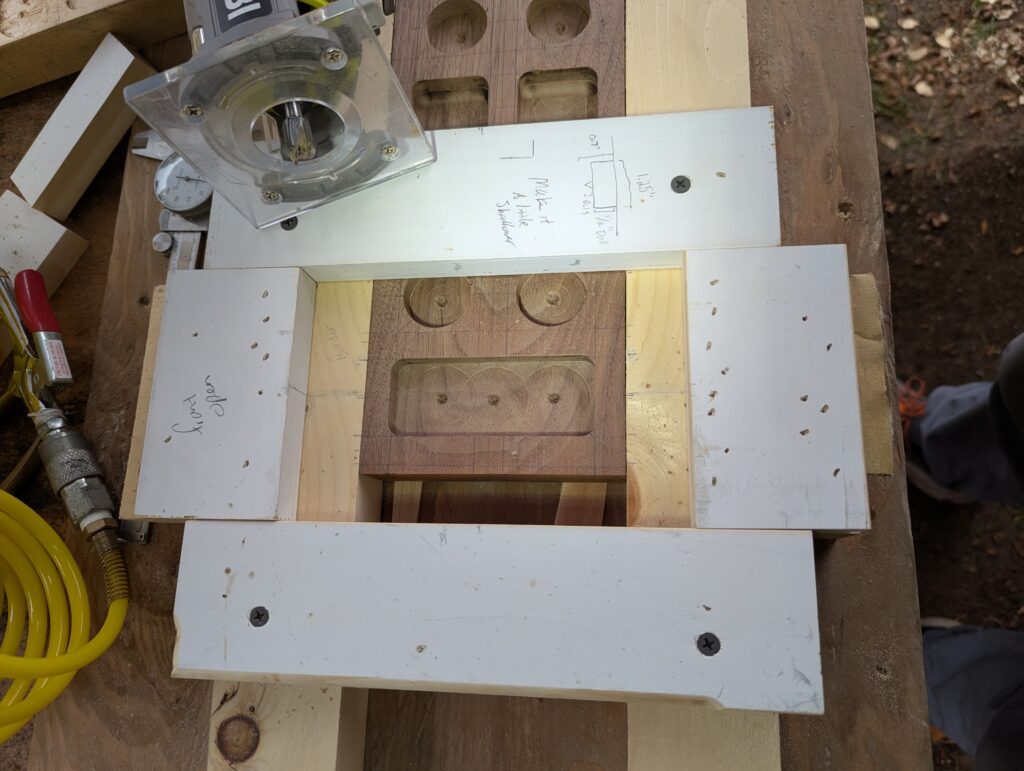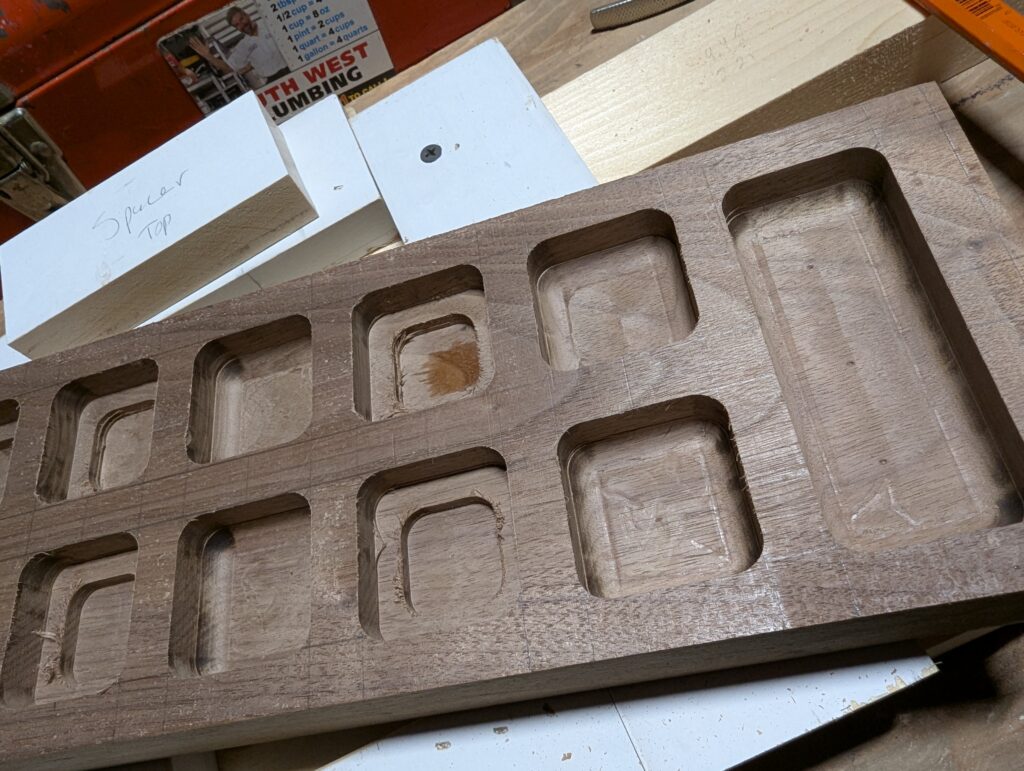 The 1/2″ cove box bit rounded the bottom of the cups nicely, but jig placement and depth control left artifacts in the wood that will need further manual finessing and finishing.