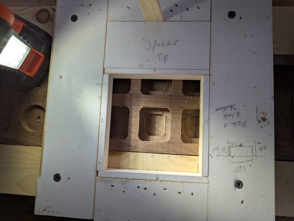 Into the routing jig it goes for shaping the mancala cups. As you can see above, a squircle shape was chosen, which is easily achieved with a squared jig shape and the right diameter bits. A 1/2″ diameter straight router bit was used to squircle out the round forstner holes.